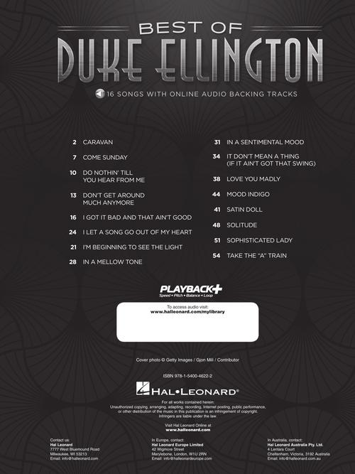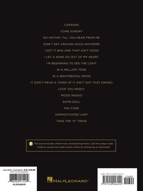 16 renditions of Duke Ellington jazz classics in arrangements for piano, voice and guitar with awesome online audio backing tracks featuring a full back-up jazz ensemble so you can sound like you're playing with a band. Songs include: Caravan · Come Sunday · Do Nothin' Till You Hear from Me · Don't Get Around Much Anymore · I Got It Bad and That Ain't Good · I Let a Song Go Out of My Heart · I'm Beginning to See the Light · In a Mellow Tone · In a Sentimental Mood · It Don't Mean a Thing (If It Ain't Got That Swing) · Love You Madly · Mood Indigo · Satin Doll · Solitude · Sophisticated Lady · Take the A Train.