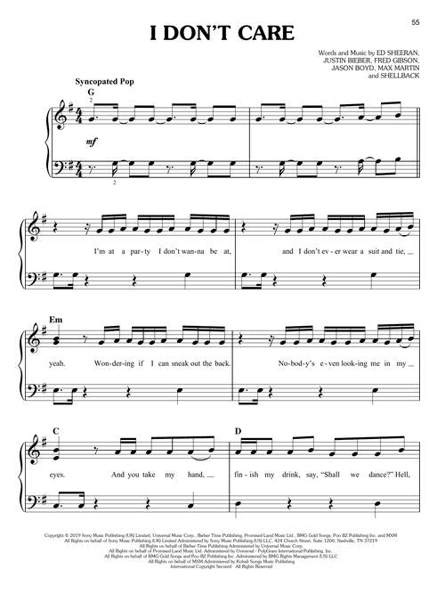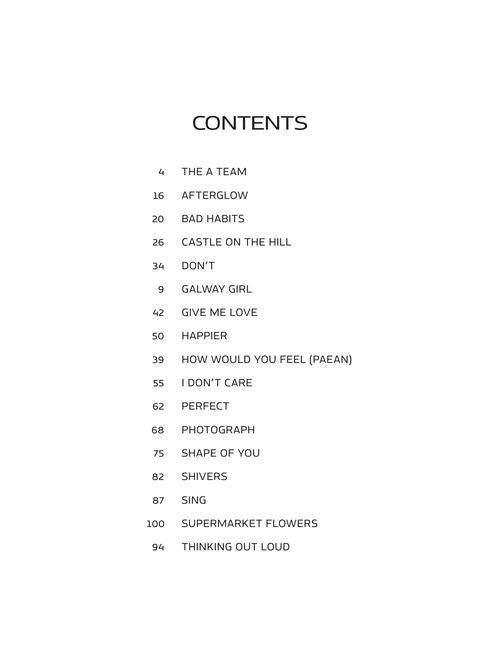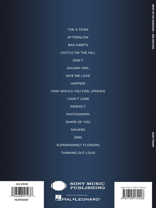 This updated collection features 17 Sheeran favorites from 2012's The A Team to 2021's Bad Habits arranged for easy piano with lyrics. Songs include: The A Team · Afterglow · Bad Habits · Castle on the Hill · Don't · Galway Girl · Give Me Love · Happier · How Would You Feel (Paean) · I Don't Care · Perfect · Photograph · Shape of You · Shivers · Sing · Supermarket Flowers · Thinking Out Loud.