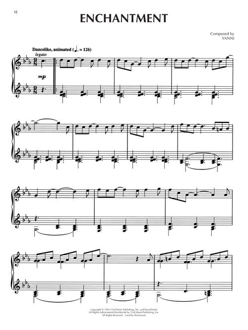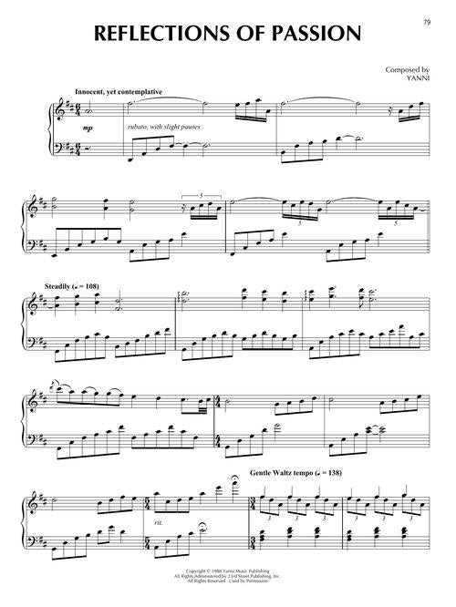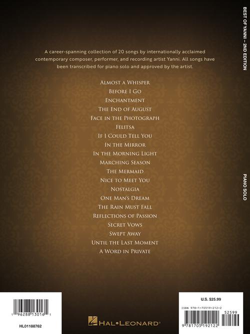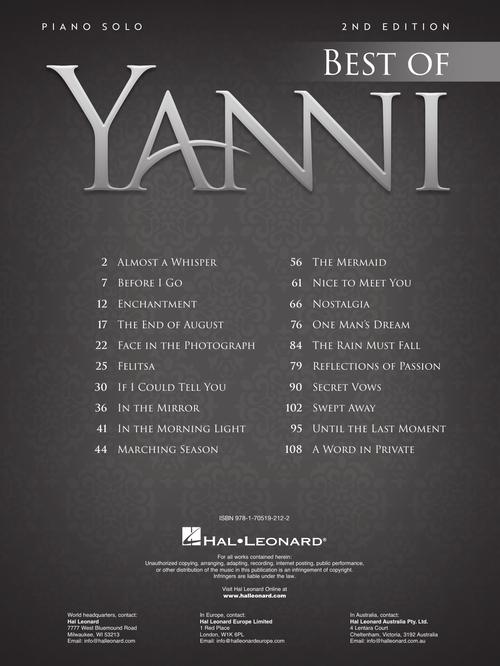 This folio is a career-spanning collection of 2 songs by internationally-acclaimed contemporary composer, performer, and recording artist Yanni. All songs have been transcribed for piano solo and approved by the artist. Titles include: In the Morning Light · Marching Season · The Mermaid · Nostalgia · One Man's Dream · The Rain Must Fall · Swept Away · Until the Last Moment · and more.