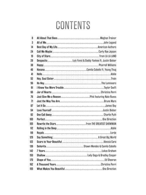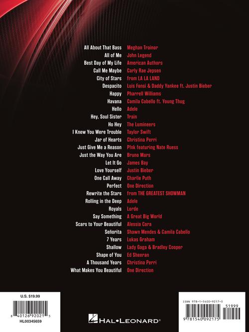 30 of the decade's most enduring hits in accessible big-note piano arrangements for beginning pianists. Includes: All About That Bass (Meghan Trainor) · Call Me Maybe (Carly Rae Jepsen) · Happy (Pharrell) · Havana (Camila Cabello) · Hey, Soul Sister (Train) · I Knew You Were Trouble (Taylor Swift) · Love Yourself (Justin Bieber) · Perfect (Ed Sheeran) · Rolling in the Deep (Adele) · 7 Years (Lukas Graham) · Shallow (Lady Gaga & Bradley Cooper) · A Thousand Years (Christina Perri) · and more.
