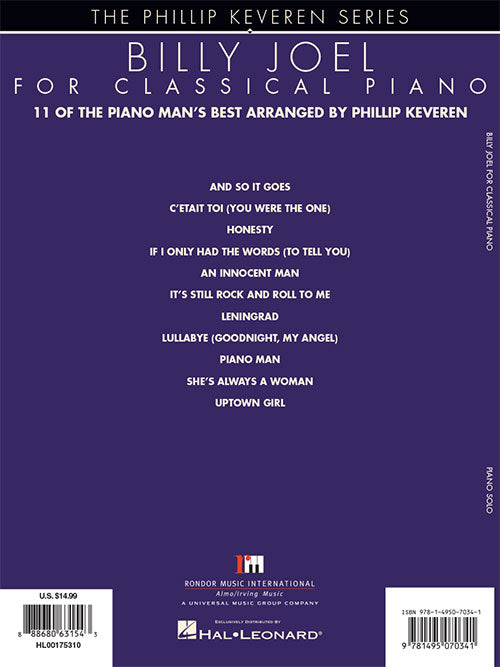 11 of the Piano Man's best as arranged by Phillip Keveren in classical piano style. Songs include: And So It Goes · C'etait Toi (You Were the One) · Honesty · If I Only Had the Words (To Tell You) · An Innocent Man · It's Still Rock and Roll to Me · Leningrad · Lullabye (Goodnight, My Angel) · Piano Man · She's Always a Woman · Uptown Girl.