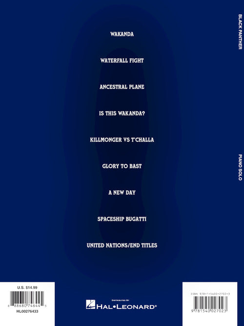 9 selections from the original score of this monster blockbuster movie produced by Marvel Studios. Piano solo arrangements of Ludwig Göransson's compositions are included: Ancestral Plane · Glory to Bast · Is This Wakanda? · Killmonger Vs T'Challa · A New Day · Spaceship Bugatti · United Nations/End Titles · Wakanda · Waterfall Fight.