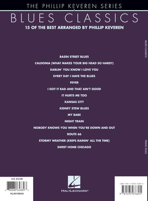 15 of the best blues classics arranged for solo piano by Phillip Keveren: Basin Street Blues · Caldonia (What Makes Your Big Head So Hard?) · Darlin' You Know I Love You · Every Day I Have the Blues · Fever · I Got It Bad and That Ain't Good · It Hurts Me Too · Kansas City · Kidney Stew Blues · My Babe · Night Train · Nobody Knows You When You're Down and Out · Route 66 · Stormy Weather (Keeps Rainin' All the Time) · Sweet Home Chicago.