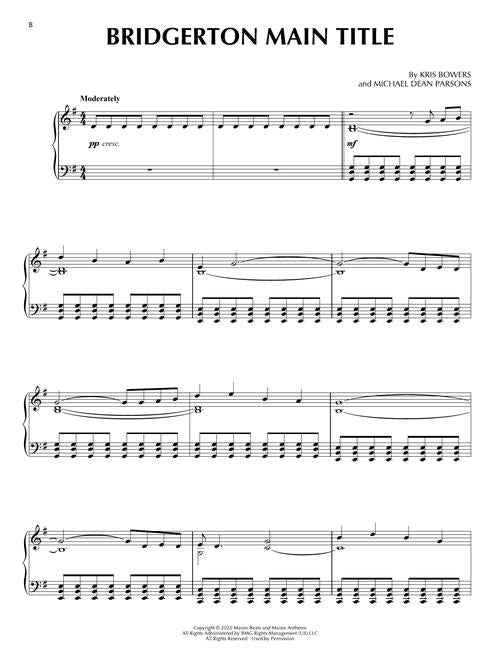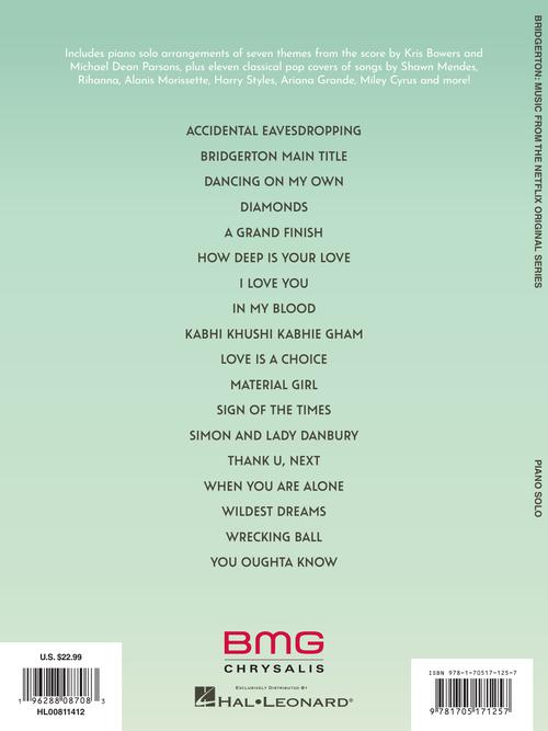Even Lady Whistledown would put down the pen to hit the keys with this songbook featuring piano solo arrangements of music featured in both seasons of the blockbuster Netflix series. It includes seven themes from the score by Kris Bowers and Michael Dean Parsons plus eleven classical pop covers of songs by Shawn Mendes, Rihanna, Alanis Morissette, Ariana Grande, Miley Cyrus, and more! Songs include: Bridgerton Main Title · Diamonds · How Deep Is Your Love · In My Blood · Love Is a Choice · Material Girl · Thank U, Next · Wildest Dreams · Wrecking Ball · You Oughta Know · and more.