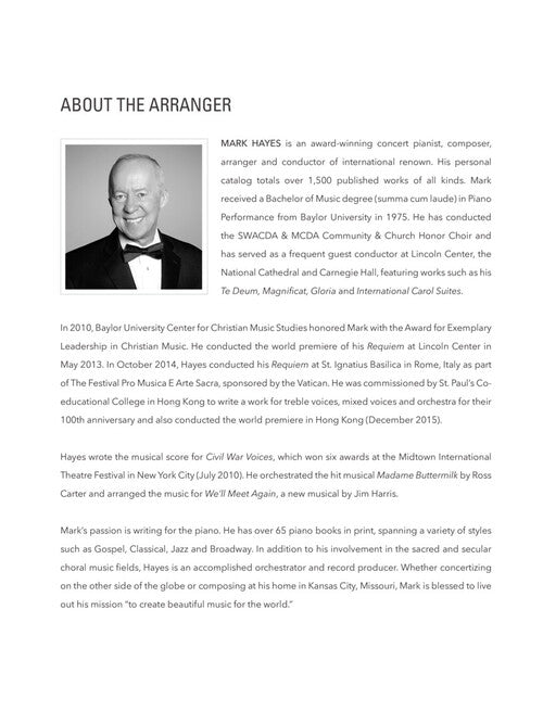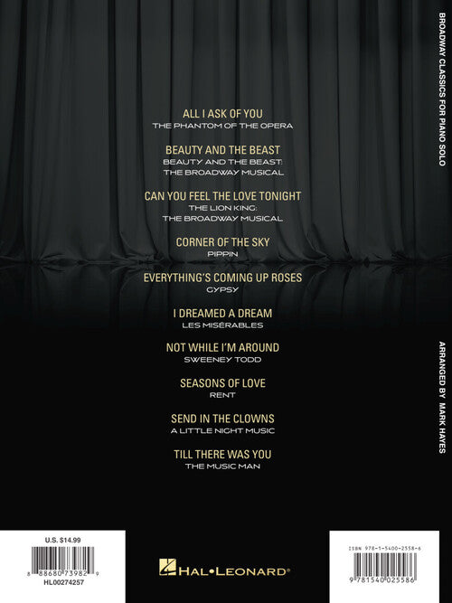 10 favorites from the Great White Way expertly arranged by Mark Hayes for piano solo. Includes: All I Ask of You · Beauty and the Beast · Can You Feel the Love Tonight · Corner of the Sky · Everything's Coming up Roses · I Dreamed a Dream · Not While I'm Around · Seasons of Love · Send in the Clowns · Till There Was You.