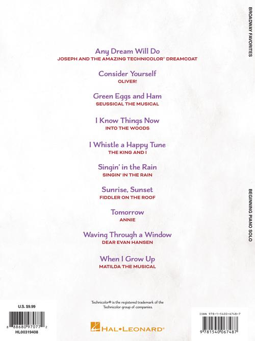 Ten top tunes from the Great White Way in accessible beginning piano solo arrangements with lyrics. Includes: Any Dream Will Do · Consider Yourself · Green Eggs and Ham · I Know Things Now · I Whistle a Happy Tune · Singin' in the Rain · Sunrise, Sunset · Tomorrow · Waving Through a Window · When I Grow Up.