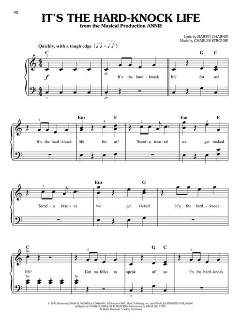 Includes 19 beloved songs from the Great White Way in easy piano arrangements, accessible for kids. Songs: Beauty and the Beast · Castle on a Cloud · Do-Re-Mi · Gary, Indiana · Into the Woods · It's the Hard-Knock Life · Let Me Entertain You · Part of Your World · The Sound of Music · Tomorrow · Where Is Love? · and more.