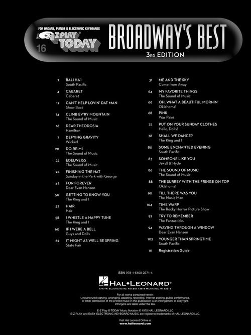 30 songs from early Broadway standards to the most recent blockbusters are featured in this 3rd edition: Bali Ha'i · Cabaret · Dear Theodosia · Defying Gravity · Edelweiss · Getting to Know You · Hair · It Might As Well Be Spring · Oh, What a Beautiful Mornin' · Put on Your Sunday Clothes · The Surrey with the Fringe on Top · Time Warp · Waving Through a Window · Younger Than Springtime · and more.