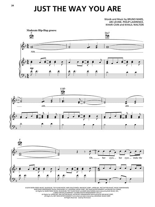 Your favorite sheet music will come to life with the innovative Piano Play-Along series! With these collections featuring online audio, piano and keyboard players will be able to practice and perform with professional-sounding accompaniments. Containing eight cream-of-the-crop songs each, the books feature new engravings, with a separate vocal staff, plus guitar frames, so players and their friends can sing or strum along. The audio features two tracks for each tune: a full performance for listening, and a separate backing track that lets players take the lead on keyboard. The high-quality, sound-alike accompaniments exactly match the printed music. This volume includes eight of Bruno Mars' best, including: Count on Me · Grenade · It Will Rain · Just the Way You Are · Locked Out of Heaven · Marry You · Treasure · When I Was Your Man. The audio is accessed online using the unique code inside each book and can be streamed or downloaded. The audio files include PLAYBACK+, a multi-functional audio player that allows you to slow down audio without changing pitch, set loop points, change keys, and pan left or right.