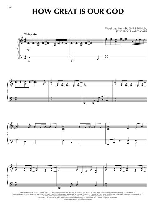12 worship favorites from America's Worship Leader, arranged for intermediate piano solo. Titles include: Amazing Grace (My Chains Are Gone) · Good Good Father · How Great Is Our God · Jesus Messiah · Resurrection Power · Whom Shall I Fear (God of Angel Armies) · and more.