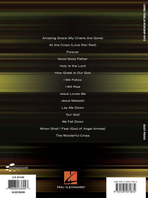 15 songs arranged for easy piano from the best-selling, Grammy Award-winning Christian artist whose songs are sung by millions of Christians at worship services every week. Songs include: Amazing Grace (My Chains Are Gone) · At the Cross (Love Ran Red) · Forever · Good Good Father · Holy Is the Lord · How Great Is Our God · I Will Follow · I Will Rise · Jesus Loves Me · Jesus Messiah · Lay Me Down · Our God · We Fall Down · Whom Shall I Fear (God of Angel Armies) · The Wonderful Cross.