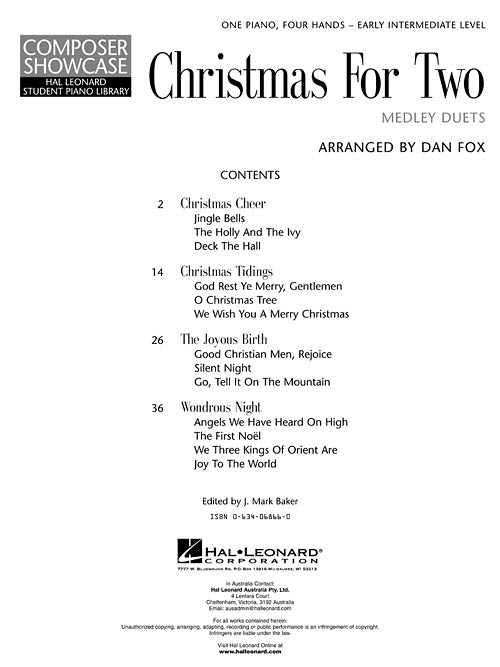 Perfect for church or studio, these four delightful medleys incorporate 13 Christmas classics, including: Angels We Have Heard on High · Deck the Hall · First Noel, The · Go, Tell It on the Mountain · The Holly and the Ivy · Joy to the World · O Christmas Tree · Silent Night · We Wish You a Merry Christmas · and more.