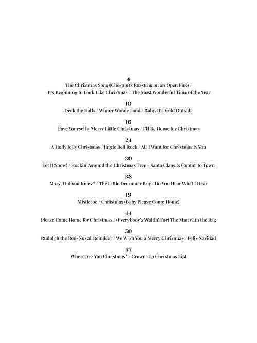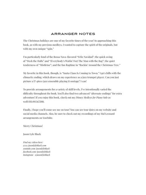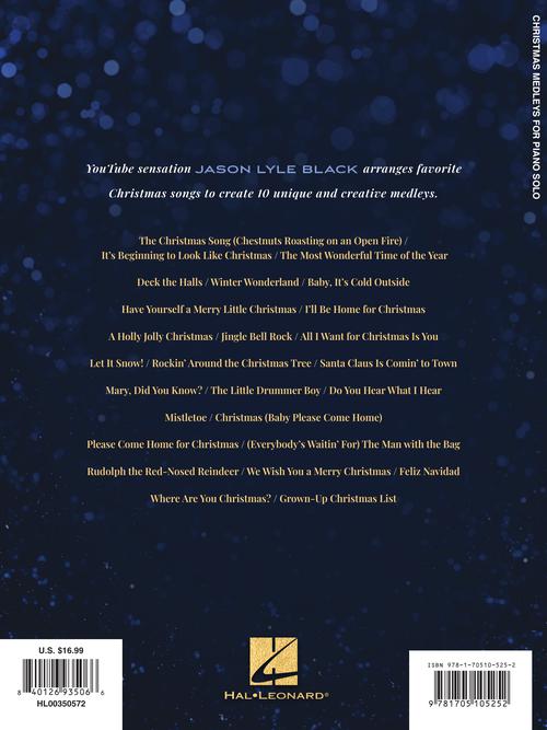 26 popular holiday songs creatively arranged by Backwards Piano Man Jason Lyle Black into memorable medleys for piano solo. Songs included in the medleys: All I Want for Christmas Is You · Baby, It's Cold Outside · Feliz Navidad · Grown-Up Christmas List · Have Yourself a Merry Little Christmas · I'll Be Home for Christmas · Jingle Bell Rock · (Everybody's Waitin' For) The Man with the Bag · Mary, Did You Know? · Please Come Home for Christmas · Rockin' Around the Christmas Tree · Where Are You Christmas? · and more.