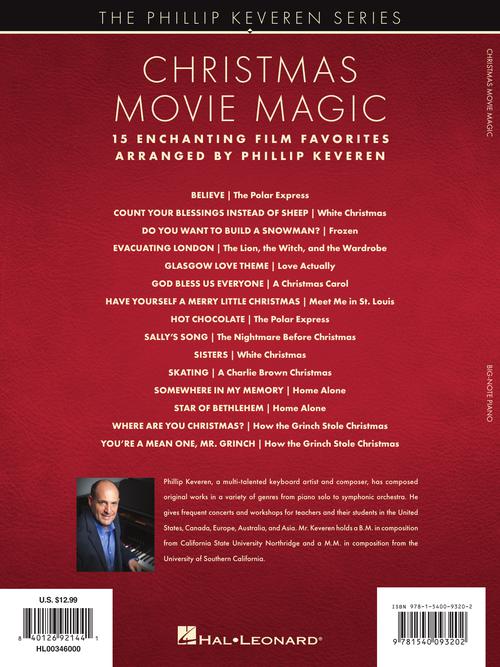 Accessible even to early-level pianists, the 15 big-note arrangements in this collection are familiar holiday movie classics presented with Phillip's unique touch! Includes: Believe (from The Polar Express) · Do You Want to Build a Snowman? (from Frozen) · Glasgow Love Theme (from Love Actually) · God Bless Us Everyone (from A Christmas Carol) · Have Yourself a Merry Little Christmas (from Meet Me in St. Louis) · Skating (from A Charlie Brown Christmas) · Somewhere in My Memory (from Home Alone) · You're a Mean One, Mr. Grinch (from How the Grinch Stole Christmas) · and more. Arrangements also include lyrics for sing-along fun.