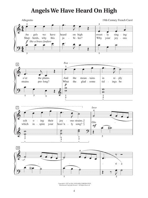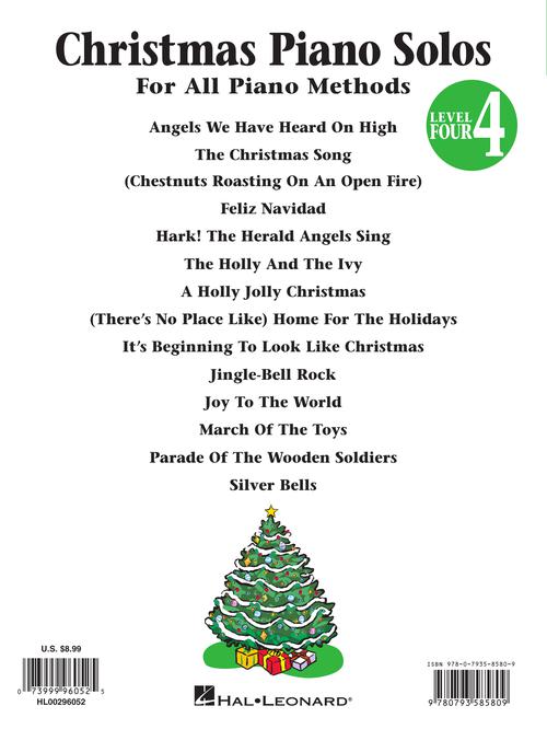 This great collection of favorite Christmas Songs correlates with Hal Leonard Student Piano Library Piano Lessons Book 4, and is a perfect supplementary book for all methods. Advancing students will love the great-sounding arrangements, easy-to-learn, and richly rewarding to play! 13 songs: Angels We Have Heard on High · The Christmas Song (Chestnuts Roasting on an Open Fire) · Feliz Navidad · Hark! the Herald Angels Sing · The Holly and the Ivy · A Holly Jolly Christmas · (There's No Place Like) Home for the Holidays · It's Beginning to Look like Christmas · Jingle-Bell Rock · Joy to the World · March of the Toys · Parade of the Wooden Soldiers · Silver Bells. Level: Early Intermediate. Notation includes all note values and rests, including eighths/dotted-eighths; swing eighths and syncopation; 3/4, 4/4, 6/8, 12/8 and Cut Time; syncopated & simple pedaling; intervals through an 8va; three-note chords. D.S. al Coda; Songs fall within one-octave scale patterns in the keys of C, G, F, and Am. Reading range: Bass Clef outer Ledger C-Treble Clef outer Ledger D.