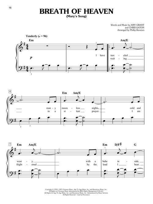 19 wonderful seasonal songs for the aspiring pianist and/or singer cleverly arranged by Phillip Keveren. Songs include: Because It's Christmas (For All the Children) · Believe · Blue Christmas · Breath of Heaven (Mary's Song) · Christmas Time Is Here · Mary, Did You Know? · Merry Christmas, Darling · River · Star of Bethlehem · White Christmas · Who Would Imagine a King · and more.