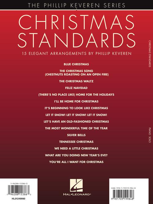 15 timeless Christmas songs beautifully arranged by Phillip Keveren for piano solo. Titles: Blue Christmas · The Christmas Song (Chestnuts Roasting on an Open Fire) · The Christmas Waltz · Feliz Navidad · (There's No Place Like) Home for the Holidays · I'll Be Home for Christmas · It's Beginning to Look Like Christmas · Let It Snow! Let It Snow! Let It Snow! · Let's Have an Old Fashioned Christmas · The Most Wonderful Time of the Year · Silver Bells · Tennessee Christmas · We Need a Little Christmas · What Are You Doing New Year's Eve? · You're All I Want for Christmas.