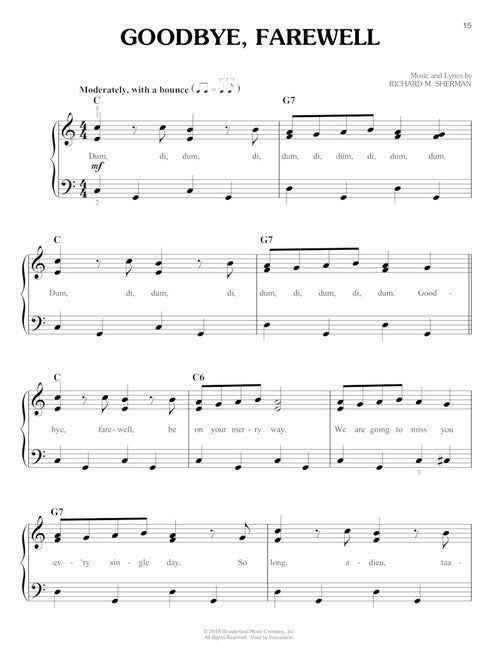 9 selections from the soundtrack to this 2018 live action/CGI fantasy film based on the Winnie the Pooh book by A.A. Milne and E.H. Shepard are presented in this folio for easy piano. Includes 3 songs penned by Richard M. Sherman: Busy Doing Nothing · Christopher Robin · and Goodbye, Farewell; plus six more written by score composers Geoff Zanelli and Jon Brion: Evelyn Goes It Alone · Heffalump Battle · My Favorite Day · Not Doing Nothing Anymore · Storybook · Through the Tree. Includes seven pages of delightful color photos from the film!