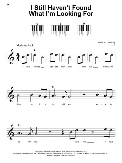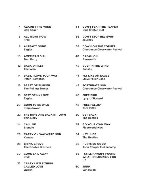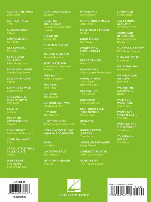 It's super easy! This series features accessible arrangements for piano, with simple right-hand melody, letter names inside each note, basic left-hand chord diagrams, and no page turns. The arrangements also include lyrics. This edition includes 60 timeless songs: Already Gone · Baby, I Love Your Way · Crazy Little Thing Called Love · Don't Stop Believin' · Free Fallin' · Hey Jude · I Still Haven't Found What I'm Looking For · Livin' on a Prayer · More Than a Feeling · Rikki Don't Lose That Number · Start Me Up · Takin' Care of Business · Walk This Way · You Really Got Me · and more.