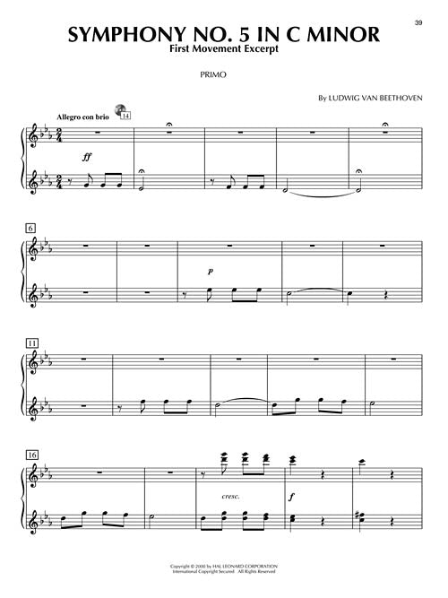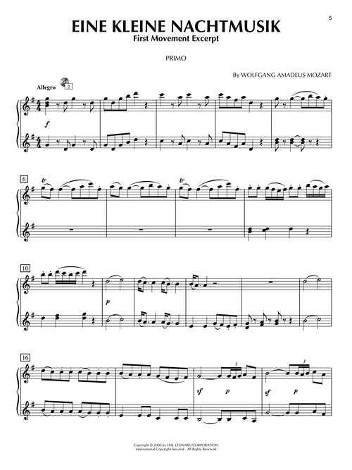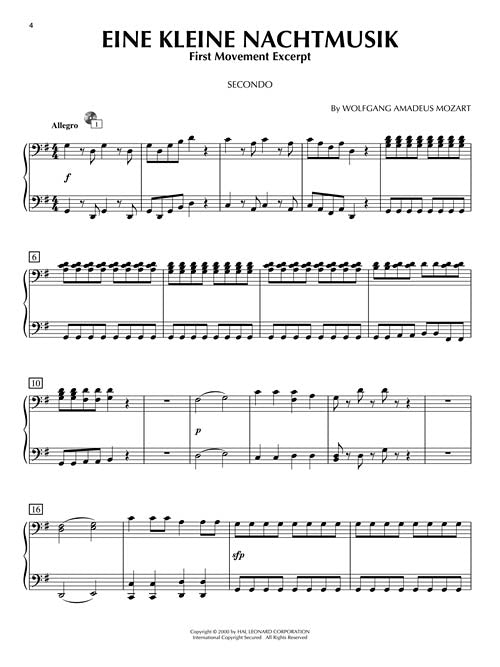 This great series comes with online audio files of separate play-along tracks for the Primo and Secondo parts - perfect for practice and performance! 8 classical masterpieces: Eine Kleine Nachtmusik (Mozart) · Liebestraum (Liszt) · A Midsummer Night's Dream (Mendelssohn) · Minuet in G Major (Beethoven) · Serenade (Ständchen) (Schubert) · Sheep May Safely Graze (J.S. Bach) · Symphony No. 5 in C Minor (Beethoven) · Symphony No. 40 in G Minor (Mozart).
