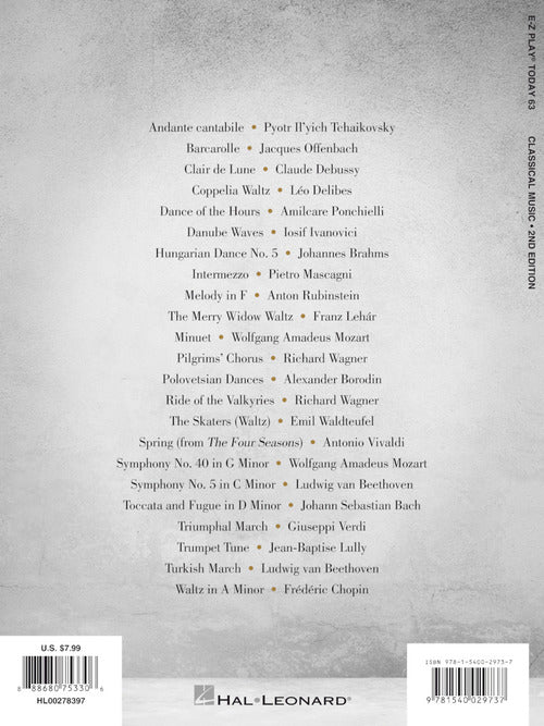 23 beautiful melodies are featured in this updated second edition of simplified E-Z Play® Today arrangements of timeless classical compositions. Includes: Barcarolle (Offenbach) · Clair De Lune (Debussy) · Dance of the Hours (Ponchielli) · Hungarian Dance No. 5 (Brahms) · Intermezzo (Mascagni) · The Merry Widow Waltz (Lehár) (includes lyrics) · Polovetsian Dances (Borodin) · Ride of the Valkyries (Wagner) · Toccata and Fugue in D Minor (Bach) · Waltz in A Minor (Chopin) · and more.