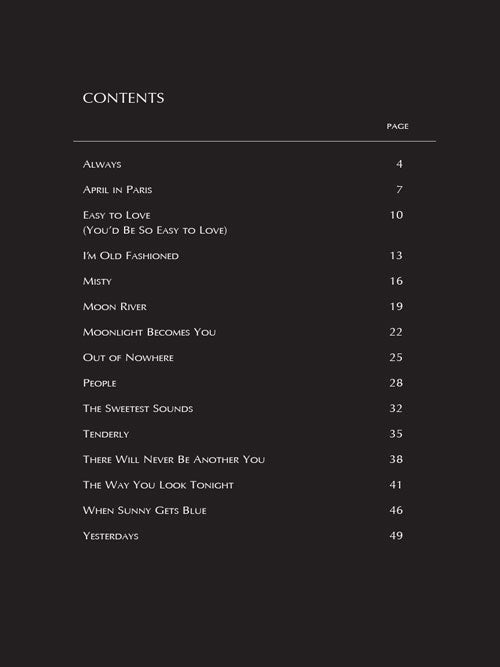 15 lush solo arrangements of jazz classics with online audio tracks containing performances of each piece by the arranger. Includes: April in Paris · Easy to Love · Misty · Moon River · Tenderly · The Way You Look Tonight · When Sunny Gets Blue · and more.