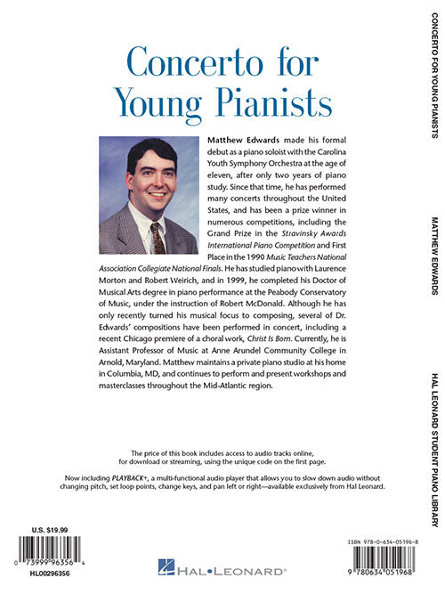 Concerto for Young Pianists HLSPL Composer Showcase NFMC 2020-2024 Selection Intermediate Level Publisher: Hal Leonard Category: Educational Keyboard Series: Educational Piano Library Format: Softcover Audio Online This exciting new concerto for the intermediate-level pianist is destined to become a classic contemporary student concerto. A NFMC 2008-2010 and 2011-2013 Junior Festival choice, this stunning work for solo piano and accompanist is written in three contrasting movements. A forward-moving first movement in D minor with ample parallel passage work in the solo piano part provides a compelling opening to the concerto. The lyrical second movement precedes a rollicking, final movement in the key of D Major. Suitable for the advancing pianist as well, this youth concerto is also a great repertoire selection for concerto festivals and competitions. Score includes two performance copies of the entire concerto. This piece includes access to an online professional recording of the second piano part allowing you to practice without a partner! The recording includes PLAYBACK+ features that allow you to slow down the audio without changing pitch, set loop points, and more. Book includes two scores. To see other NFMC selections, click here (http://www.halleonard.com/promo/promo.do?promotion=183) . Inventory # : 00296356 UPC: 73999963564 ISBN: 634051962 Width: 9" Length: 12" Height: 0.233" Product Weight: 0.7 lbs. Number of Pages: 48