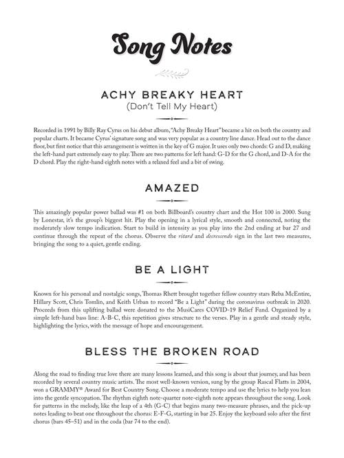 Now kids can confidently play 25 favorite country songs right away! This collection of easy piano arrangements features simple melody lines and accompaniment patterns that are easy to read, as well as song notes and practice tips for each song. Includes: Bless the Broken Road (Rascal Flatts) · Crazy (Patsy Cline) · The Devil Went Down to Georgia (Charlie Daniels Band) · The Gambler (Kenny Rogers) · God Bless the U.S.A. (Lee Greenwood) · I Hope You Dance (Lee Ann Womack) · Love Me Tender (Elvis Presley) · Ring of Fire (Johnny Cash) · Sixteen Tons (Tennessee Ernie Ford) · and more.