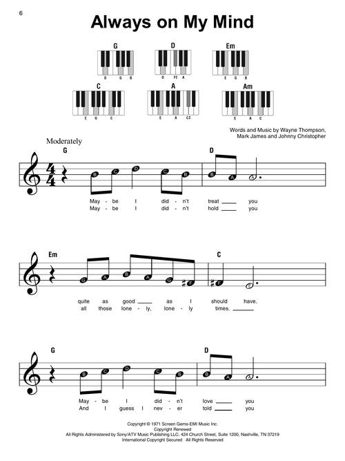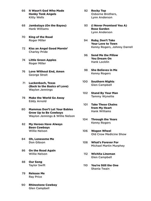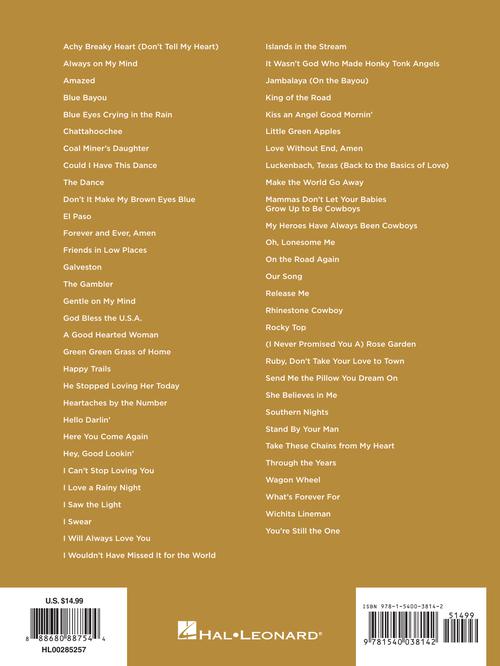 It's super easy! This series features accessible arrangements for piano, with simple right-hand melody, letter names inside each note, basic left-hand chord diagrams, and no page turns. This edition includes 60 country classics: Always on My Mind · Blue Bayou · Could I Have This Dance · El Paso · Friends in Low Places · The Gambler · Hey, Good Lookin' · Islands in the Stream · Jambalaya (On the Bayou) · King of the Road · Love Without End, Amen · On the Road Again · Rocky Top · Stand by Your Man · Wagon Wheel · You're Still the One · and more.
