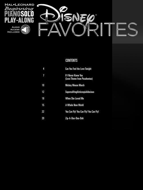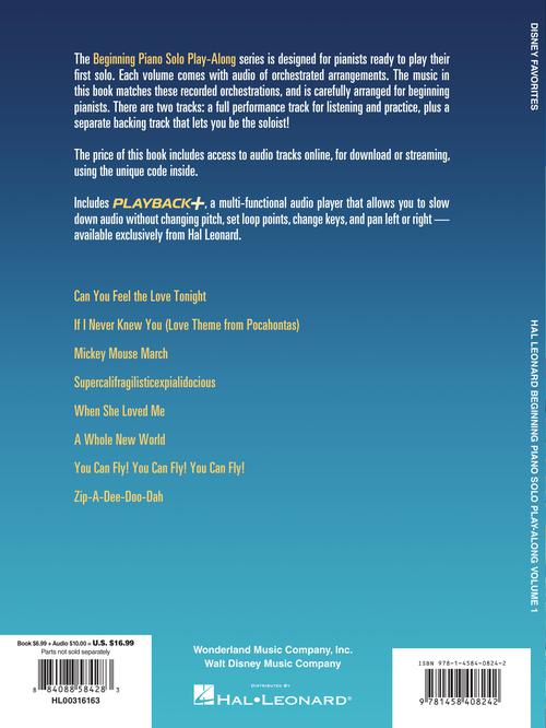 The Beginning Piano Solo Play-Along series is designed for pianists ready to play their first solo. Each volume comes with recordings of orchestrated arrangements. The music in this book matches these recorded orchestrations, and is carefully arranged for beginning pianists. There are two tracks: a full performance track for listening and practice, plus a separate backing track that lets you be the soloist! This volume features 8 Disney classics: Can You Feel the Love Tonight · If I Never Knew You (Love Theme from Pocahontas) · Mickey Mouse March · Supercalifragilisticexpialidocious · When She Loved Me · A Whole New World · You Can Fly! You Can Fly! You Can Fly! · Zip-A-Dee-Doo-Dah. Audio is accessed online using the unique code inside the book and can be streamed or downloaded. The audio files include PLAYBACK+, a multi-functional audio player that allows you to slow down audio without changing pitch, set loop points, change keys, and pan left or right.