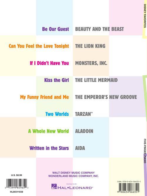 8 Disney greats arranged for beginning piano players: Be Our Guest · Can You Feel the Love Tonight · If I Didn't Have You · Kiss the Girl · My Funny Friend and Me · Two Worlds · A Whole New World · Written in the Stars.