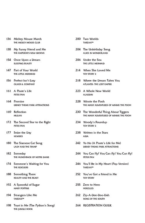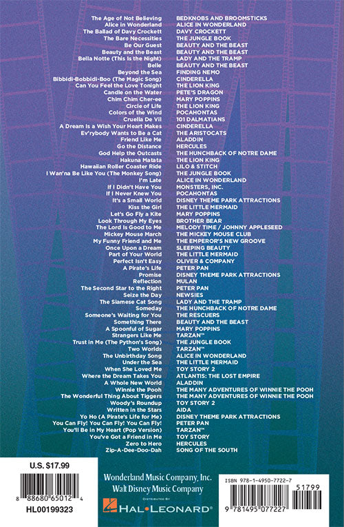 65 beloved classics arranged in big, easy-to-read notation in a small, convenient size. Songs include: The Bare Necessities · Be Our Guest · Beauty and the Beast · Can You Feel the Love Tonight · Chim Chim Cher-ee · A Dream Is a Wish Your Heart Makes · Hakuna Matata · Kiss the Girl · Mickey Mouse March · Reflection · Something There · A Spoonful of Sugar · Under the Sea · When She Loved Me · A Whole New World · You'll Be in My Heart (Pop Version) · and more.