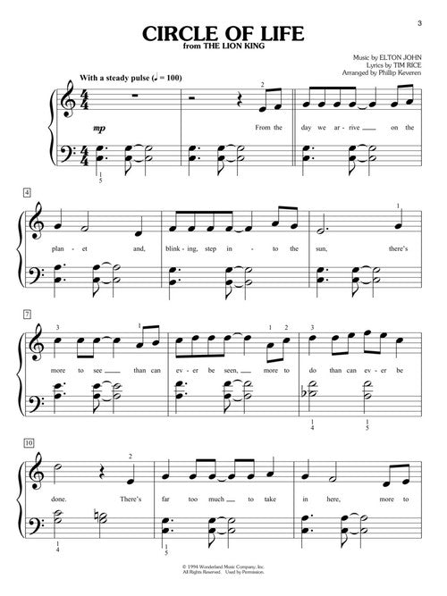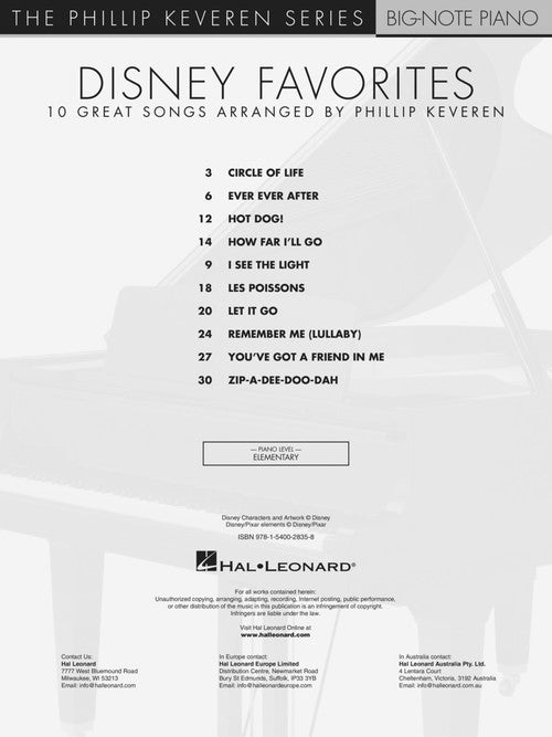 Ten great songs masterfully arranged by Phillip Keveren for Big-Note Piano, including: Circle of Life · Ever Ever After · Hot Dog! · How Far I'll Go · I See the Light · Les Poissons · Let It Go · Remember Me (Lullaby) · You've Got a Friend in Me · Zip-A-Dee-Doo-Dah.