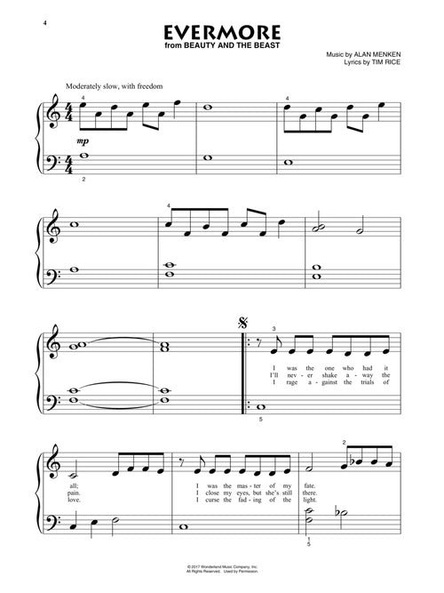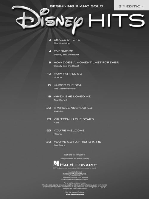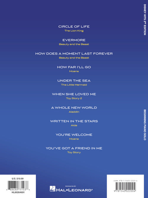 Ten Disney favs are included in this updated second edition featuring accessible arrangements for beginning piano solo. Songs: Circle of Life · Evermore · How Does a Moment Last Forever · How Far I'll Go · Under the Sea · When She Loved Me · A Whole New World · Written in the Stars · You're Welcome · You've Got a Friend in Me.