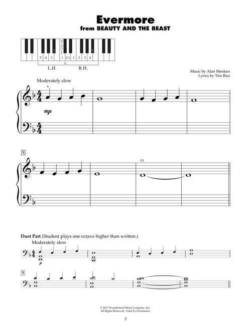 Eight easy, playable arrangements of recent Disney movie hit songs arranged in five finger piano notation. Includes: Do You Want to Build a Snowman? (from Frozen) · Evermore and How Does a Moment Last Forever (from Beauty and the Beast) · How Far I'll Go and You're Welcome (from Moana) · Remember Me (Ernesto de la Cruz); Un Poco Loco and The World Es Mi Familia (from Coco). Hal Leonard Five-Finger Piano songbooks are designed for students in their first year of study. They feature single-note melody lines that stay in one position, indicated by a small keyboard diagram at the beginning of each song. Each song also includes lyrics and beautifully written piano accompaniments that can be played by teachers, parents or more experienced students.