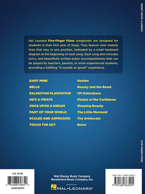 8 Disney classics arranged for absolute beginners with a great-sounding optional duet part for teachers or parents to play to make the student sound even better! Songs include: Baby Mine · Belle · Dalmatian Plantation · He's a Pirate · Once upon a Dream · Part of Your World · Scales and Arpeggios · Touch the Sky.