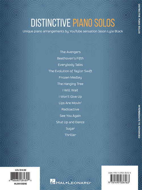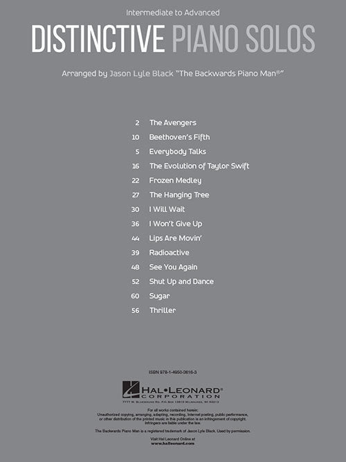 This collection features unique piano solo of 14 arrangements by The Backwards Piano Man® Jason Lyle Black, including: Everybody Talks · The Evolution of Taylor Swift · Frozen Medley · I Will Wait · Lips Are Movin · Radioactive · Shut Up and Dance · Sugar · Thriller · and more.