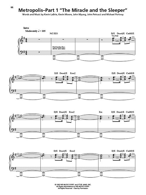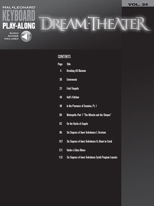 The Keyboard Play-Along series will help you play your favorite songs as played by your favorite artists quickly and easily. Just follow the music in the book, listen to the audio to hear how the keyboard should sound, and then play along using the separate backing tracks. Now including Playback+, a multi-functional audio player that allows you to slow down audio without changing pitch, set loop points, change keys and pan left or right. Songs include: Breaking All Illusions · Erotomania · Fatal Tragedy · Hell's Kitchen · In the Presence of Enemies - Part 1 · Metropolis-Part 1 The Miracle and the Sleeper · On the Backs of Angels · Six Degrees of Inner Turbulence: I. Overture · Six Degrees of Inner Turbulence: II. About to Crash · Under a Glass Moon.