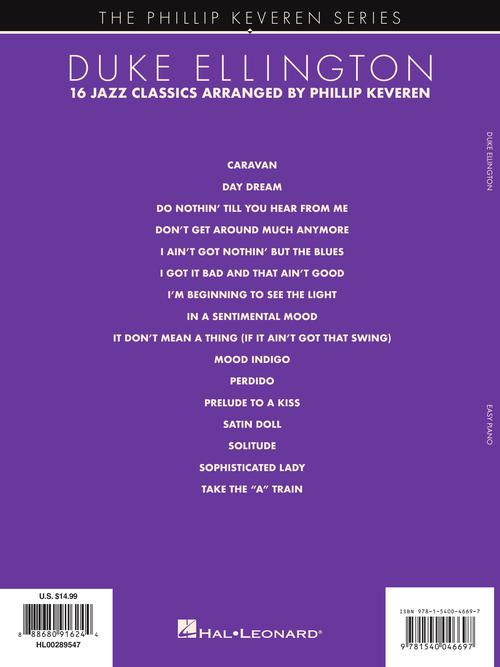 Phillip Keveren brings his masterful touch to 16 classics from the Duke for easy piano, including: Caravan · Do Nothin' Till You Hear from Me · Don't Get Around Much Anymore · In a Sentimental Mood · It Don't Mean a Thing (If It Ain't Got That Swing) · Mood Indigo · Satin Doll · Take the A Train · and more.