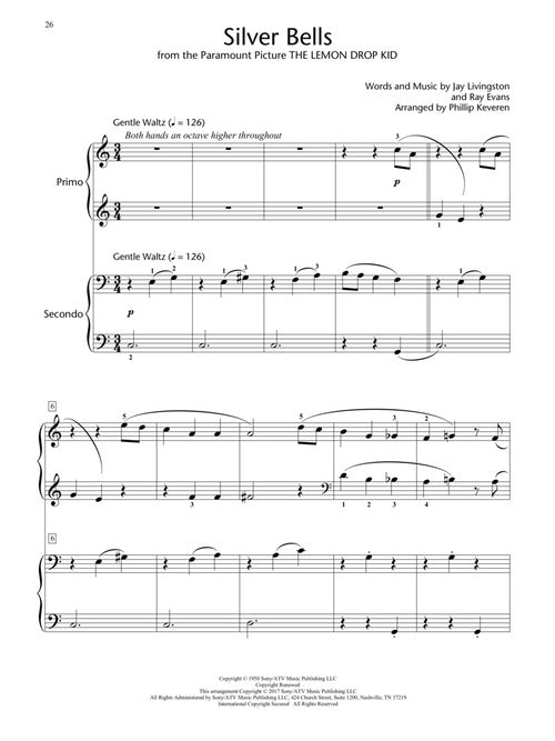 Eight wonderful duets perfect for the holidays! Composers Phillip Keveren and Mona Rejino each arranged four duets. Titles: Jingle Bell Rock · Let It Snow! Let It Snow! Let It Snow! · Linus and Lucy · The Little Drummer Boy · Reindeers Are Better Than People · Silver Bells · Sleigh Ride · Snowfall.
