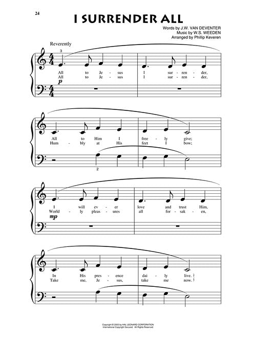 20 beloved hymns beautifully arranged by Phillip Keveren, including: All Hail the Power of Jesus' Name · Be Still My Soul · Be Thou My Vision · The Church's One Foundation · Faith of Our Fathers · How Firm a Foundation · I Surrender All · Nearer, My God, to Thee · Softly and Tenderly · 'Tis So Sweet to Trust in Jesus · and more.