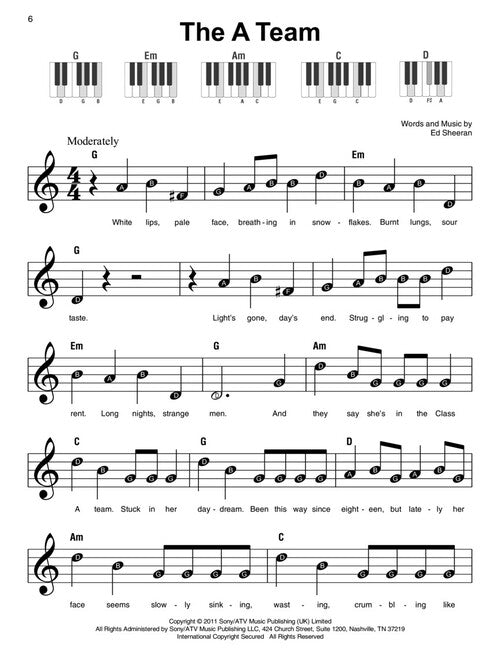 It's super easy! This series features accessible arrangements for piano, with simple right-hand melody, letter names inside each note, basic left-hand chord diagrams, and no page turns. This edition includes 20 of Sheeran's best: The A Team · Castle on the Hill · Don't · Happier · I See Fire · Lego House · Perfect · Photograph · Shape of You · Sing · Thinking Out Loud · and more.