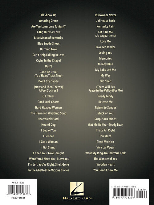 A comprehensive collection of 59 songs, including: Blue Suede Shoes · Can't Help Falling in Love · Hound Dog · In the Ghetto · Love Me Tender · and many more.