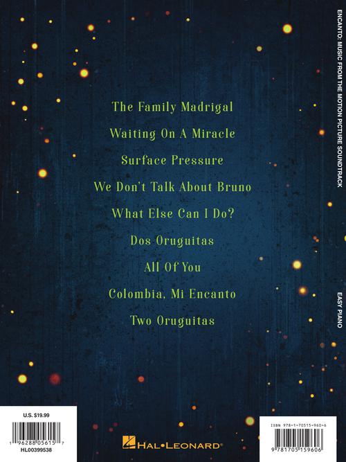 Lin-Manuel Miranda's soundtrack to Encanto has taken the music world by storm. The soundtrack and its catchy single We Don't Talk About Bruno have topped their Billboard charts, making it one of the most successful Disney musicals of all time! Our souvenir matching folio features eight pages of full-color art from the movie with 9 songs arranged for easy piano with lyrics. Songs include: All of You · Colombia, Mi Encanto · Dos Oruguitas · The Family Madrigal · Surface Pressure · Two Oruguitas · Waiting on a Miracle · We Don't Talk About Bruno · What Else Can I Do?