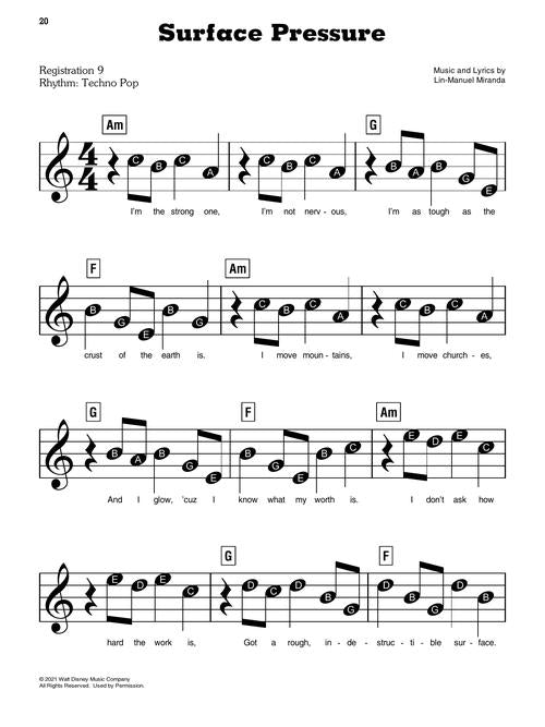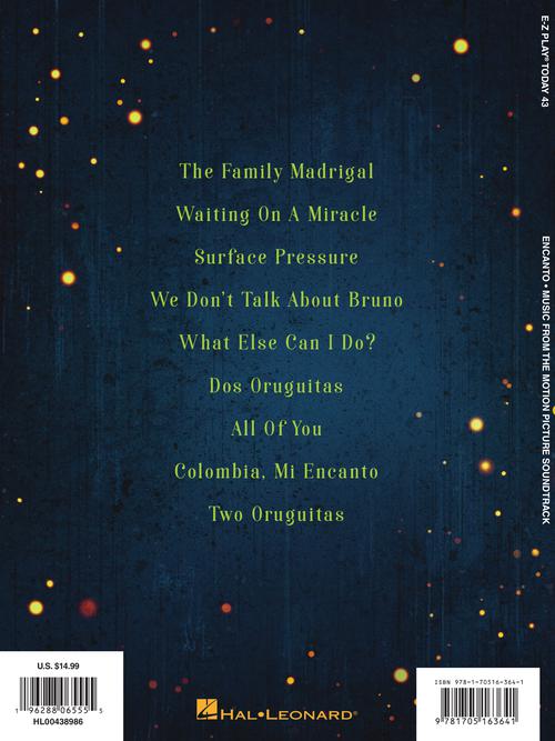 Now you can play the fun and infectious music from the smash hit Encanto on your keyboard thanks to this great new songbook featuring easy-to-read notation, lyrics, and other tips to make sure you sound great on your organ or electronic keyboard! Songs include: All of You · Colombia, Mi Encanto · Dos Oruguitas · The Family Madrigal · Surface Pressure · Two Oruguitas · Waiting on a Miracle · We Don't Talk About Bruno · What Else Can I Do?