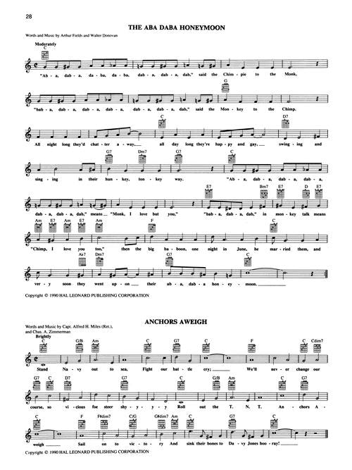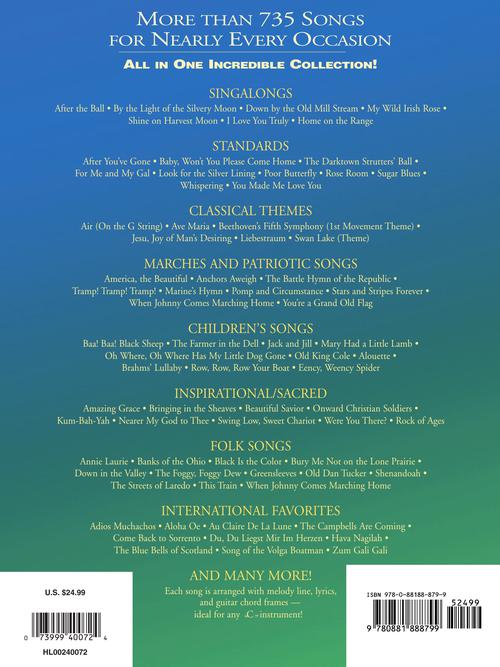The Fake Book of the World's Favorite Songs - 4th Edition is a must-own collection of more than 735 songs arranged with melody line, lyrics and guitar chord frames. It features a wide variety of songs, including singalongs, Christmas songs, classical themes, marches and patriotic songs, polkas, inspirational and sacred tunes, international folksongs, and many more. This latest edition has been updated to include even more favorites, including: A-Tisket A-Tasket · Abide with Me · After You've Gone · Air on the G String · Alexander's Ragtime Band · Aloha Oe · Alphabet Song · America the Beautiful · Anchors Aweigh · Angels We Have Heard on High · Arkansas Traveler · Au Clair De La Lune · Auld Lang Syne · Battle Hymn of the Republic · Beautiful Dreamer · Bill Bailey, Won't You Please Come Home · Blue Danube Waltz · Bury Me Not on the Lone Prairie · Chopsticks · (Oh, My Darling) Clementine · Down in the Valley · Faith of Our Fathers · Für Elise · God Rest Ye Merry, Gentlemen · His Eye Is on the Sparrow · I Wonder Who's Kissing Her Now · Jesu, Joy of Man's Desiring · Kum Ba Yah · My Old Kentucky Home · Sidewalks of New York · Take Me Out to the Ball Game · When Johnny Comes Marching Home · When the Saints Go Marching In · and hundreds more!