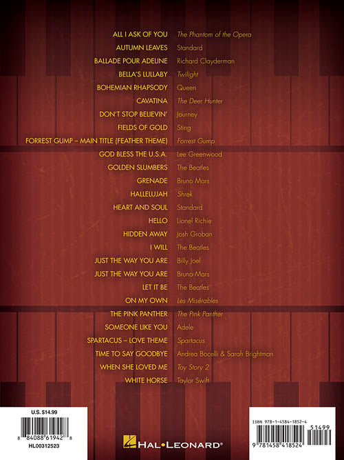27 terrific hits, standards & themes - many of which have never been available in solo arrangements! Includes: All I Ask of You · Bella's Lullaby · Bohemian Rhapsody · Don't Stop Believin' · Forrest Gump - Main Title · Grenade · Hallelujah · Hello · Just the Way You Are · Let It Be · On My Own · The Pink Panther · Someone like You · When She Loved Me · and more.