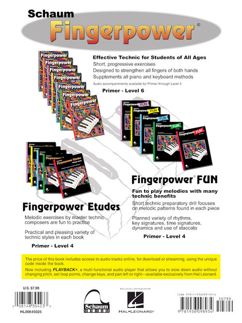 Physical training and discipline are needed for both athletics and keyboard playing. Keyboard muscle conditioning is called technic. Technic exercises are as important to the keyboard player as workouts and calisthenics are to the athlete. Schaum's Fingerpower books are dedicated to development of individual finger strength and dexterity in both hands. The price of this book includes a unique code that provides access to audio tracks online, for download or streaming. The tracks include PLAYBACK+, a multi-functional audio player that allows you to slow down audio without changing pitch, set loop points, change keys, and pan left or right - available exclusively from Hal Leonard.