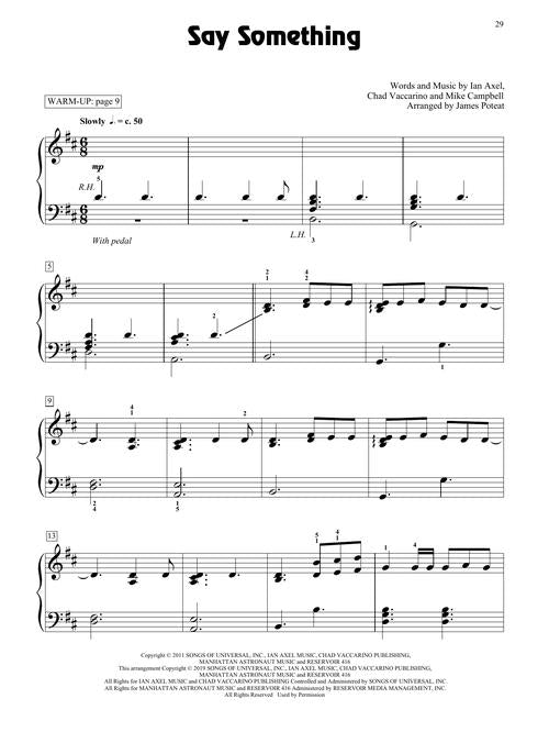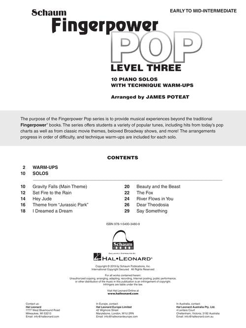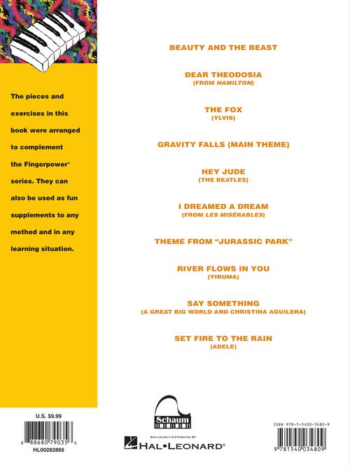 10 great pop piano solo arrangements, each with at least one fun technical warm-up! They complement the famous Fingerpower series but are also useful as motivating supplements to any method and in any learning situation. Titles: Beauty and the Beast · Dear Theodosia (Hamilton) · The Fox · Gravity Falls (Main Theme) · Hey Jude · I Dreamed a Dream (Les Miserables) · Theme from Jurassic Park · Say Something · Set Fire to Rain · more.