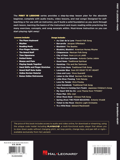 The First 15 Lessons series provides a step-by-step lesson plan for the absolute beginner, complete with audio tracks, video lessons, and real songs! Designed for self-teaching or for use with an instructor, you'll build a solid foundation as you work through each lesson, learning the basics of the instrument and music reading while practicing the many exercises, concepts and song excerpts within. Must-know instruction so you can start playing right away, with a free online metronome! The piano book features lessons on: the piano keyboard, rhythm, reading music, five-finger patterns, the grand staff, time signatures and dotted notes, sharps and flats, playing hands together, and hand shifts & finger stretches. Includes piano parts from 23 songs: Au Clair De La Lune · Blackbird · City of Stars · The Girl from Ipanema (Garota De Ipanema) · HandClap · Linus and Lucy · My Heart Will Go on (Love Theme from 'Titanic') · Piano Man · To a Wild Rose, Op. 51, No. 1 · and more.